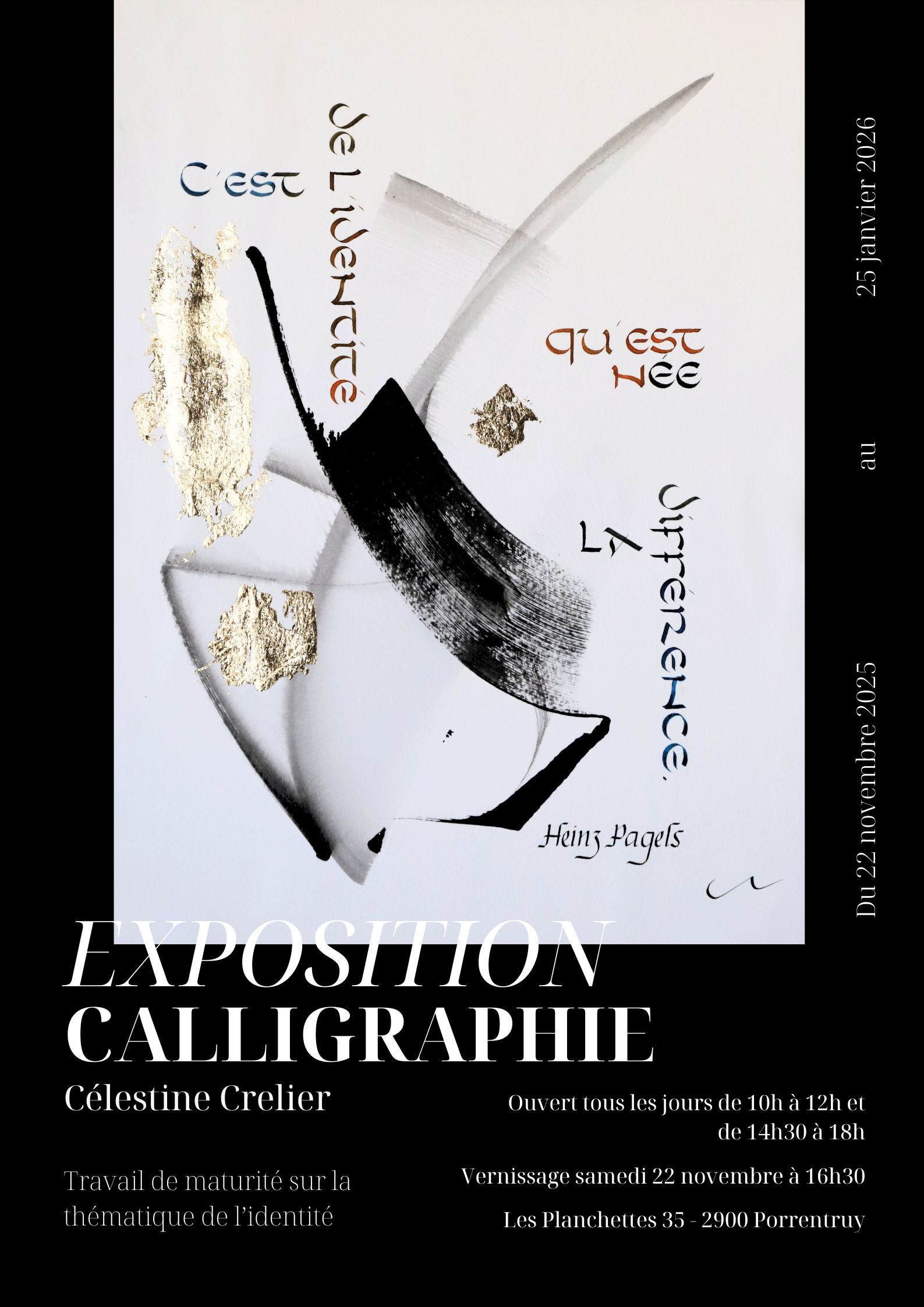 Découvrez le travail de maturité de Célestine Crelier, du 22 novembre au 25 janvier 2025, explorant avec finesse et sensibilité la thématique de l’identité. À travers ses œuvres, la calligraphie devient un miroir de l’âme, un voyage à la rencontre de soi et des autres.